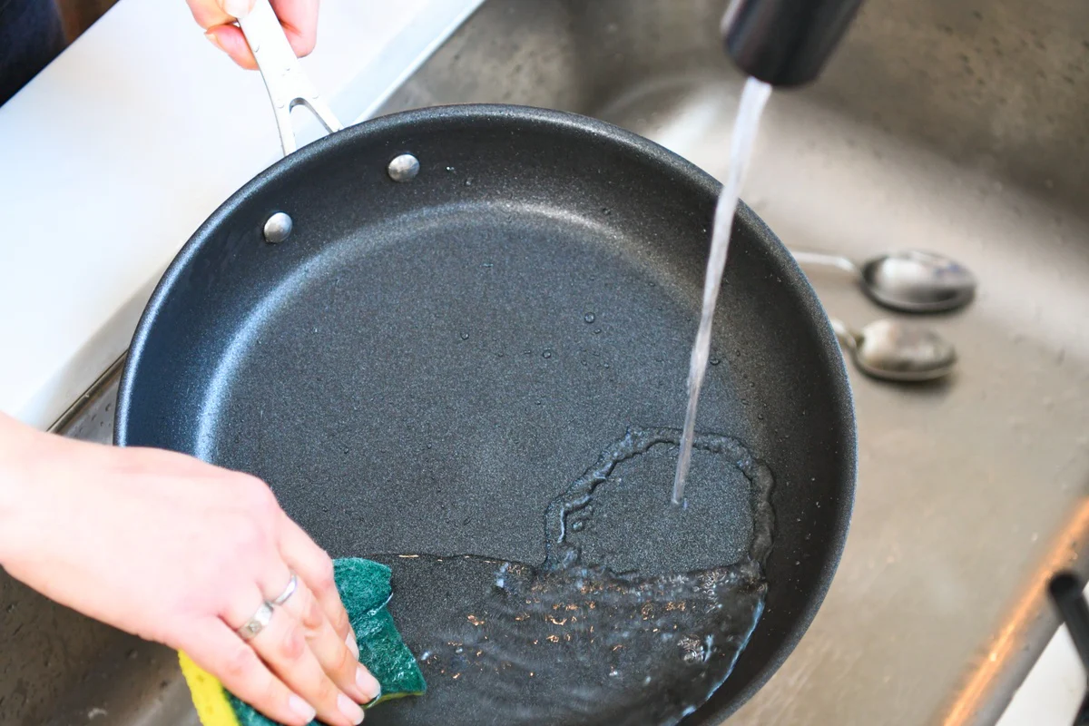 1. Đợi chảo nguội hoàn toàn trước khi rửa